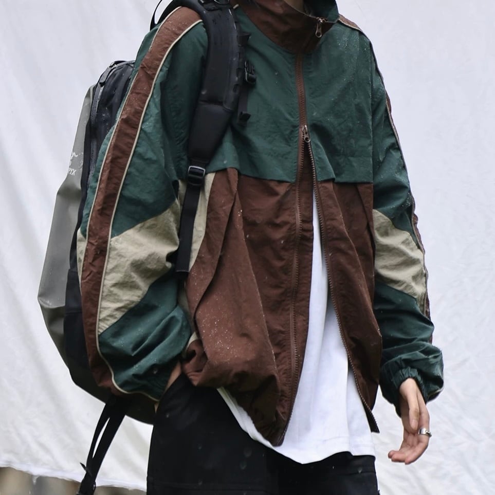 スタンドカラーとノーカラーを組み合わせた、デザイン性の高いジップアップジャケットです。