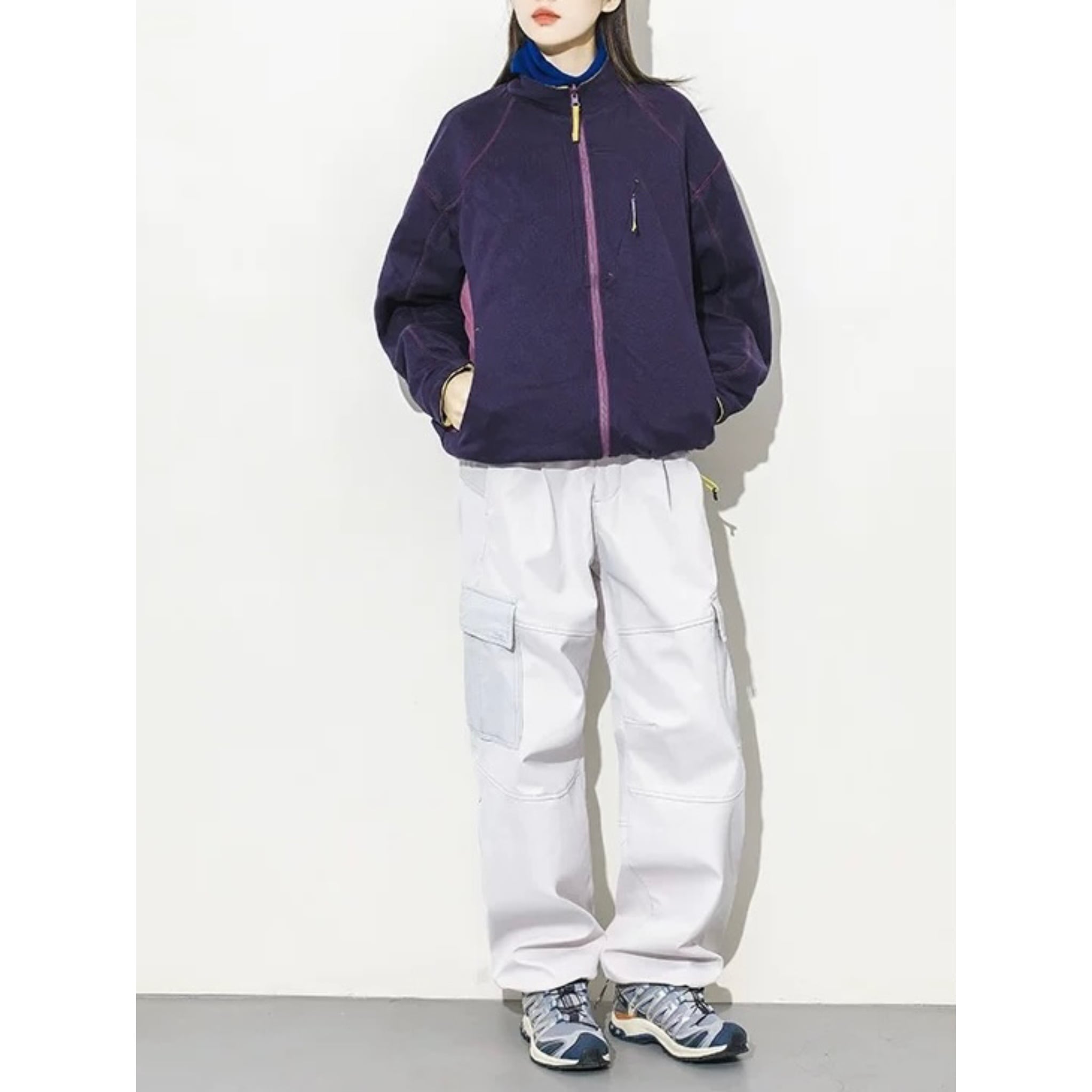 スタンドカラーの設計で首元まで暖かく、ゆったりとしたシルエットなので、スウェットやニットの上からも重ねやすいバランスです。