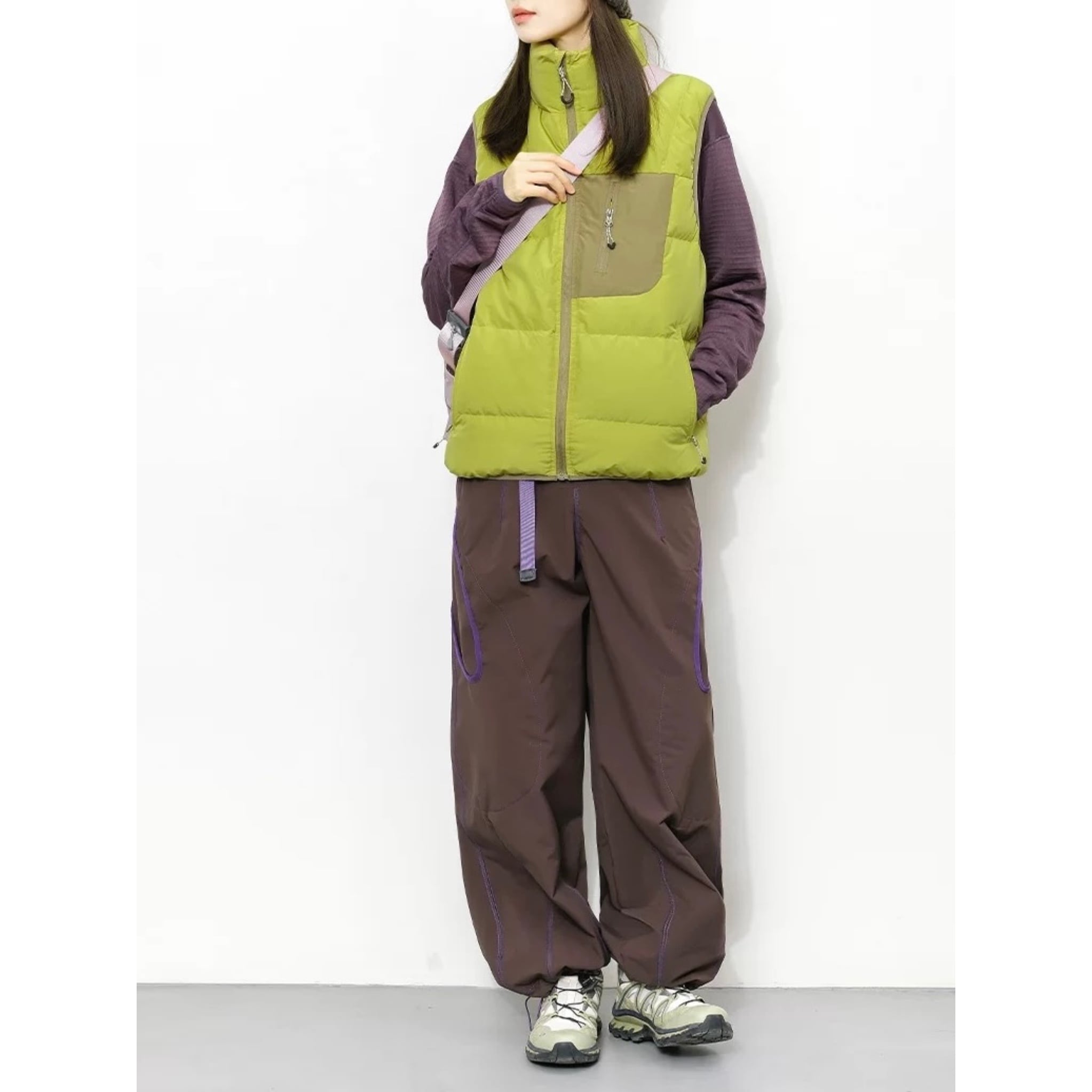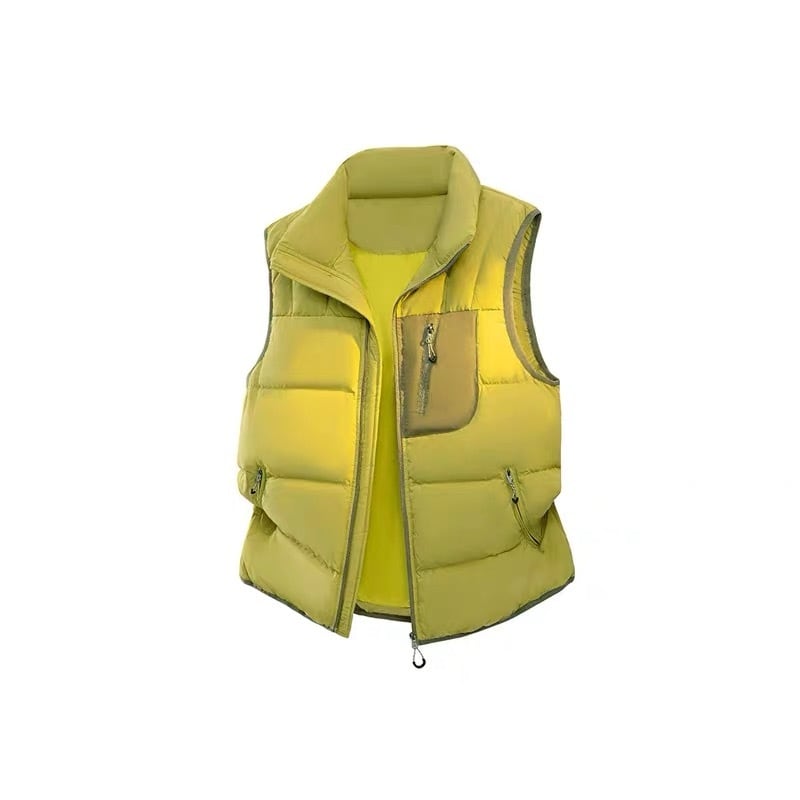 パッチワークカラーが印象的なライトダウンベスト。