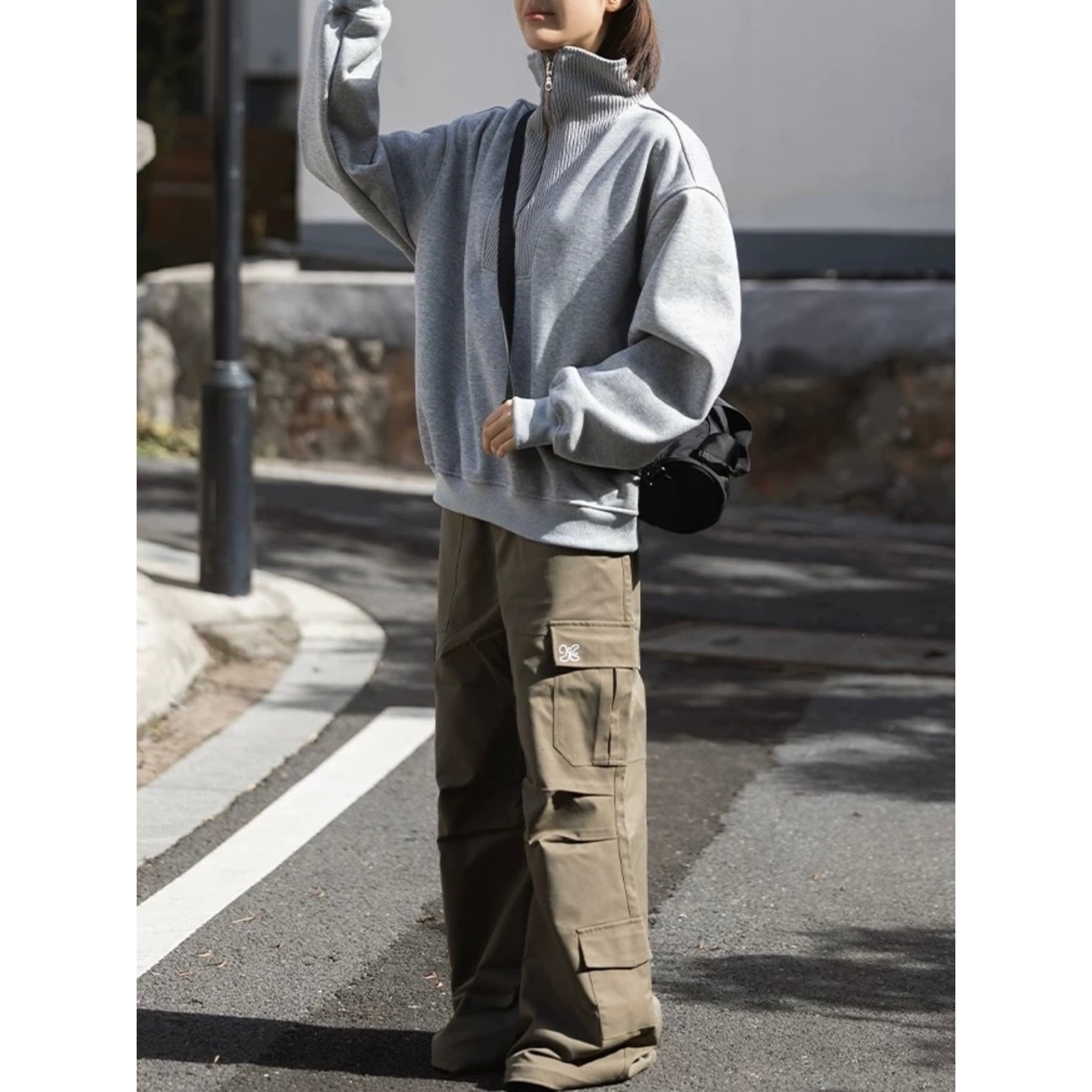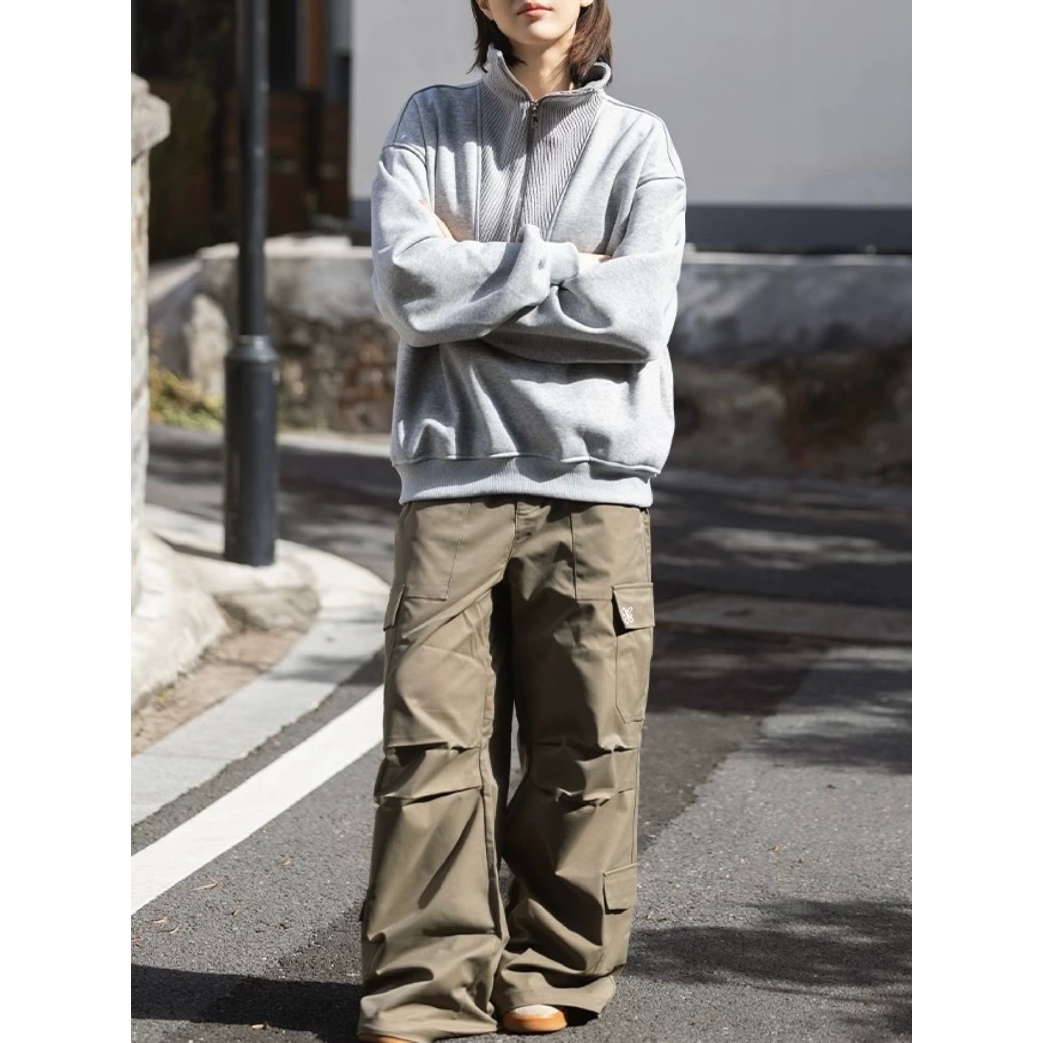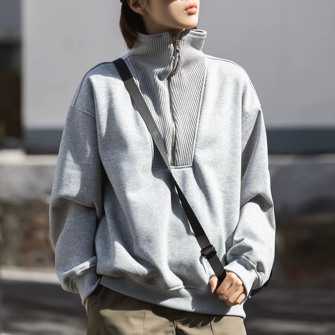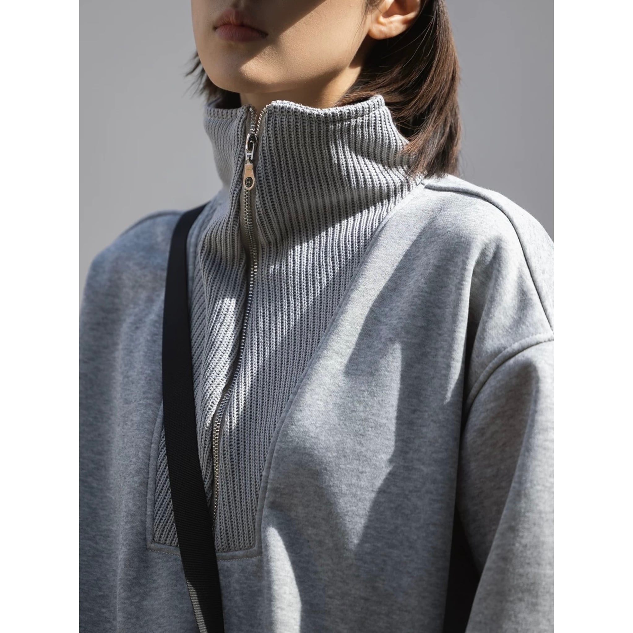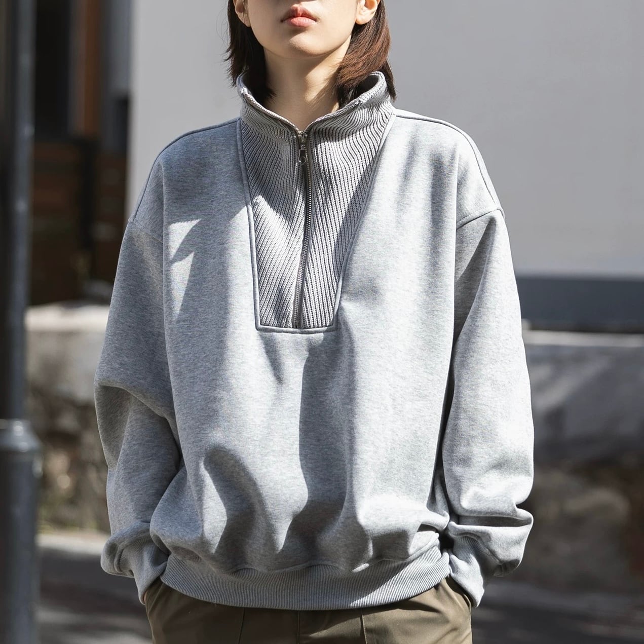 スタンドカラーとハーフジップが印象的なスウェットトップス。