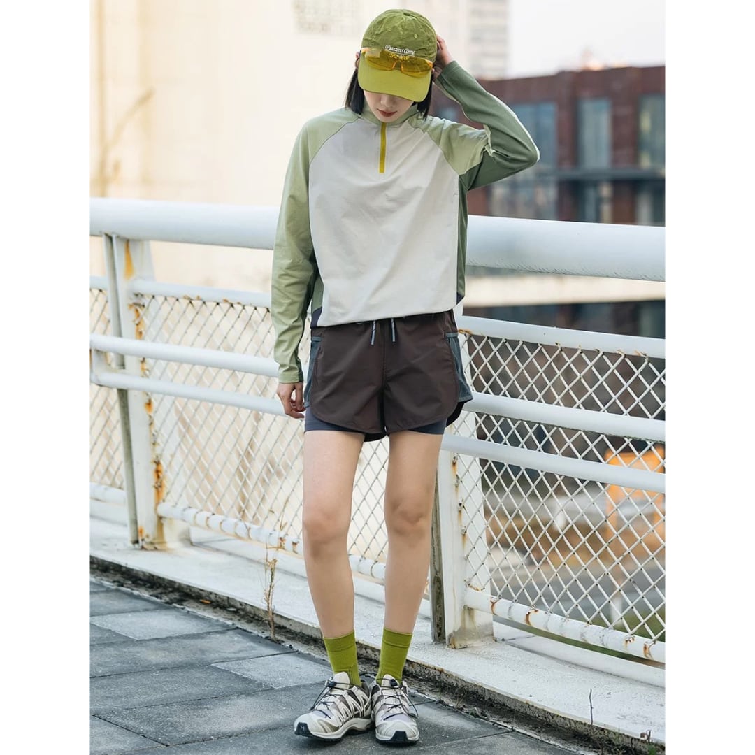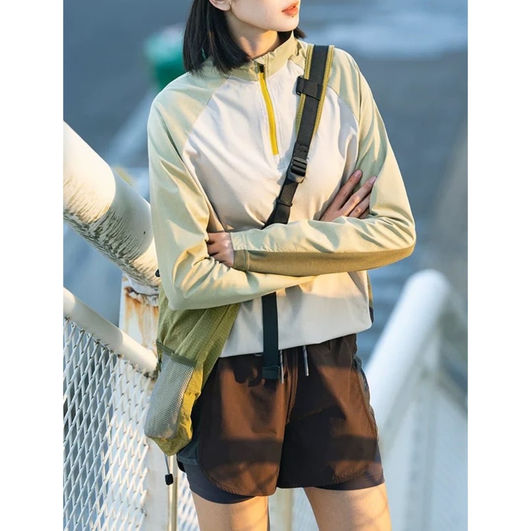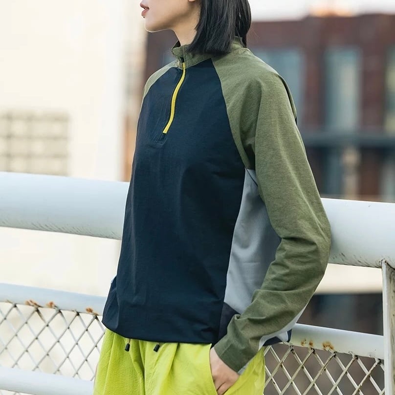 ハーフジップ仕様で着脱しやすく、温度調整もしやすい実用性の高い一着。