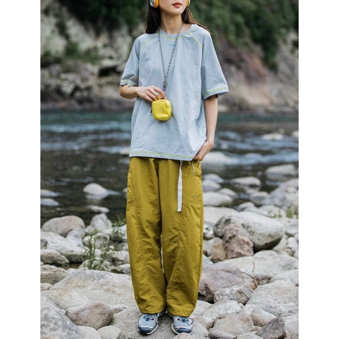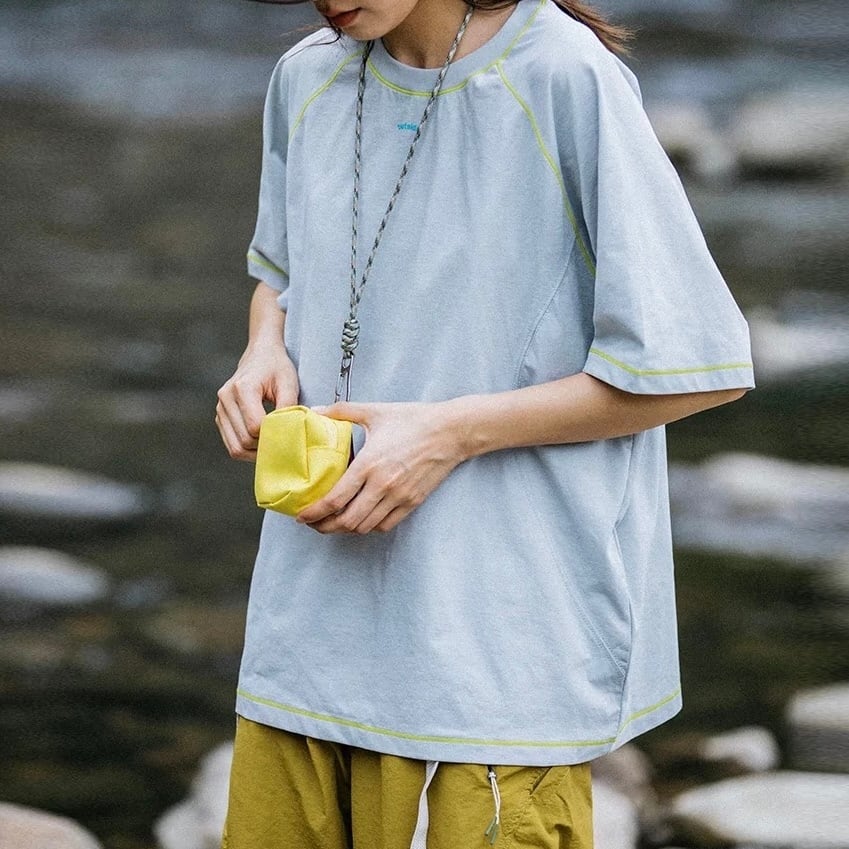 首元や袖口にあしらわれたライムグリーンのステッチが、