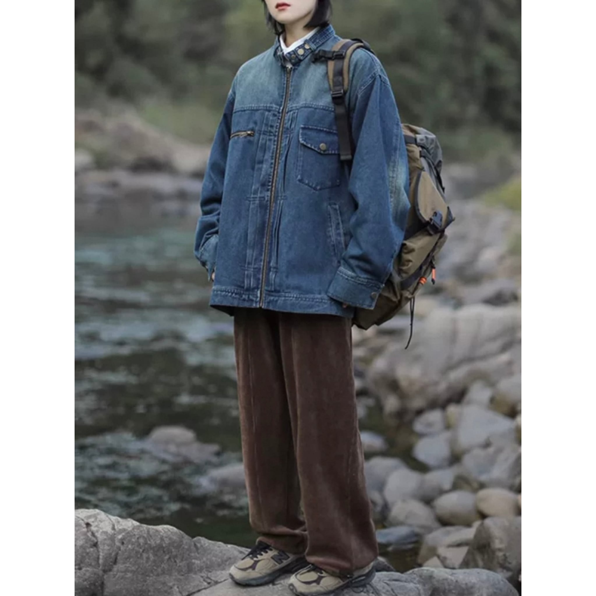 スタンドカラーとジッパーフライのデザインが、カジュアルながらも洗練された印象を与えます。