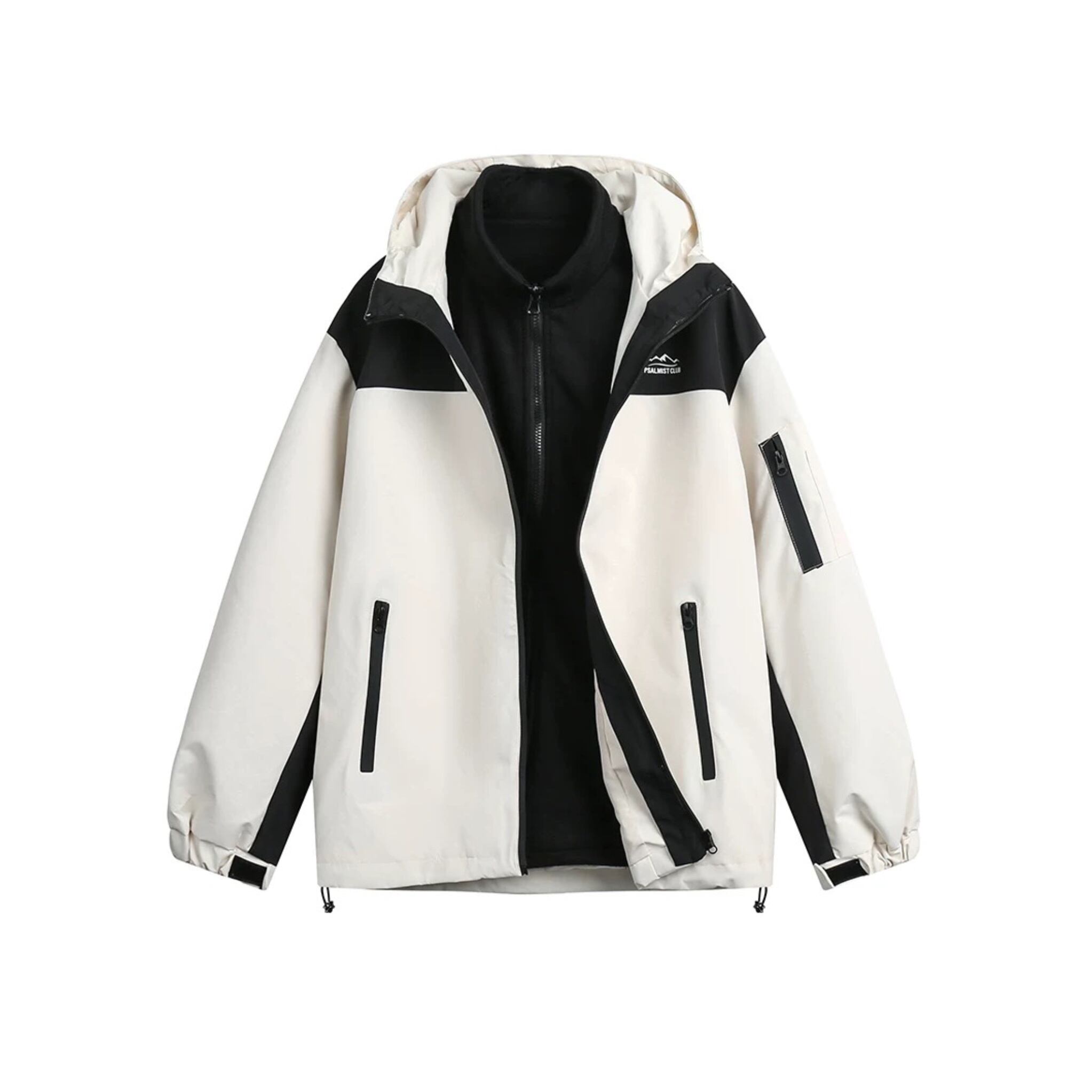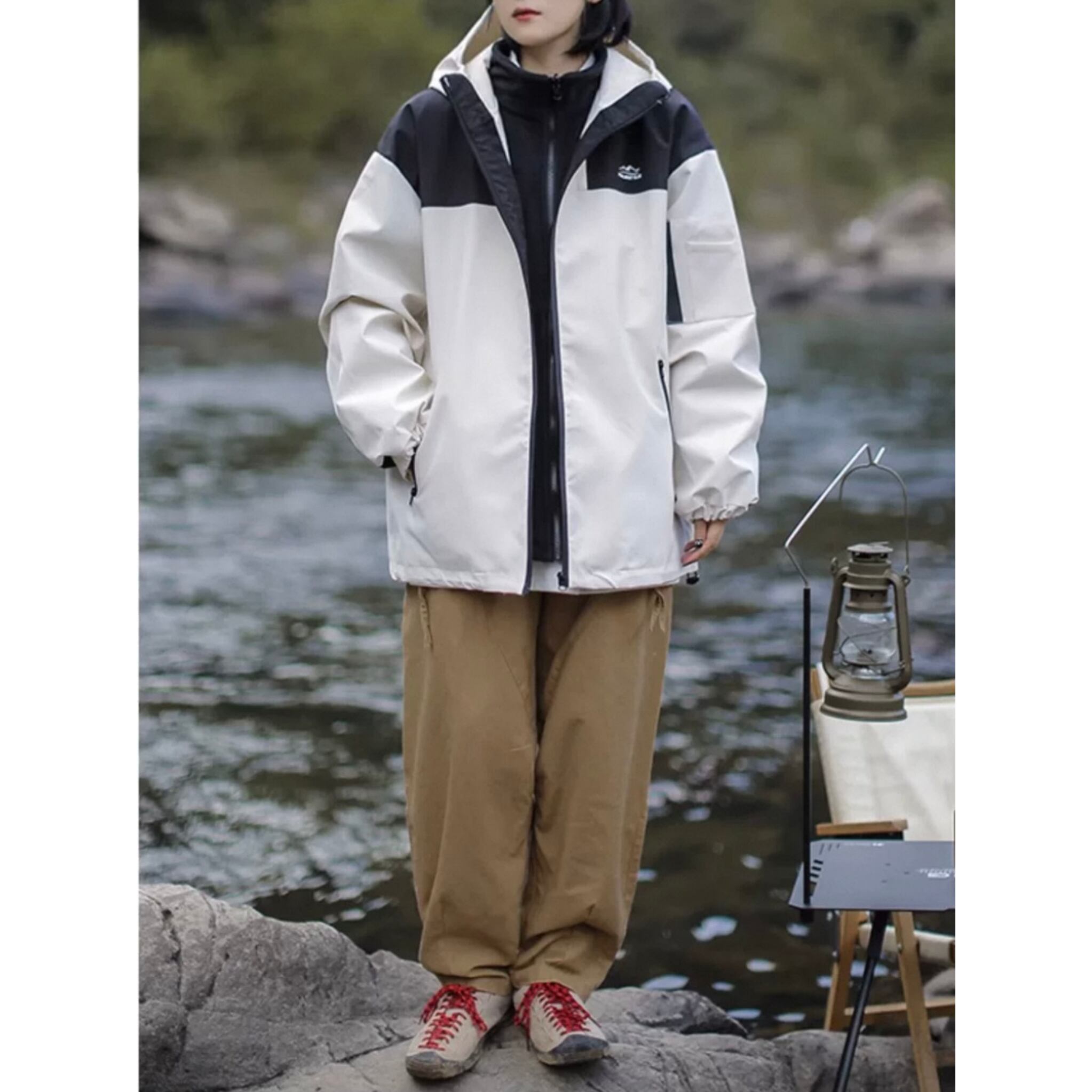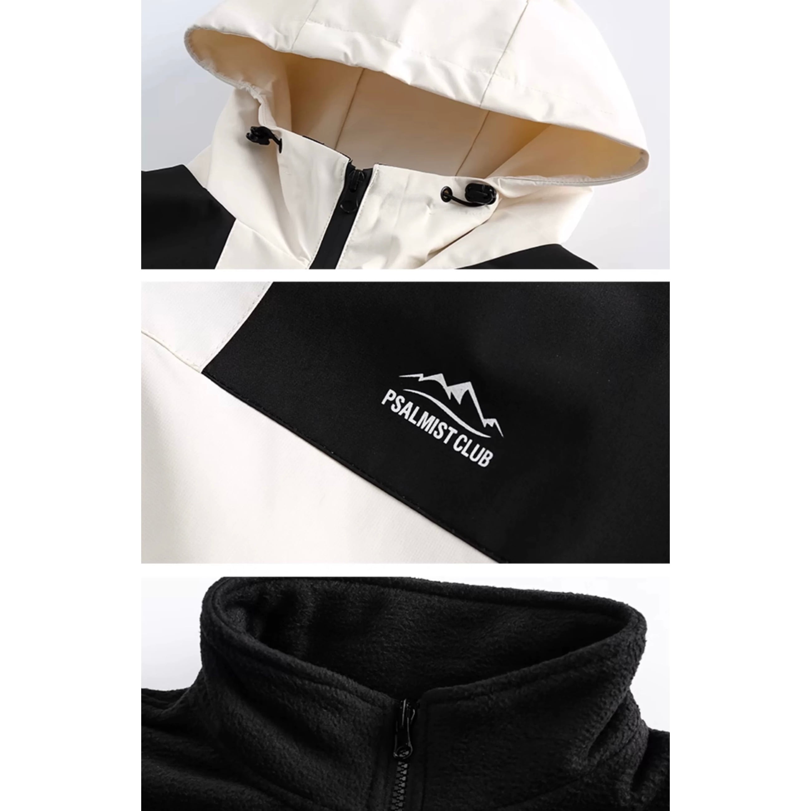 スタンドカラーとフードのデザインは、実用性とファッション性を両立しています。
